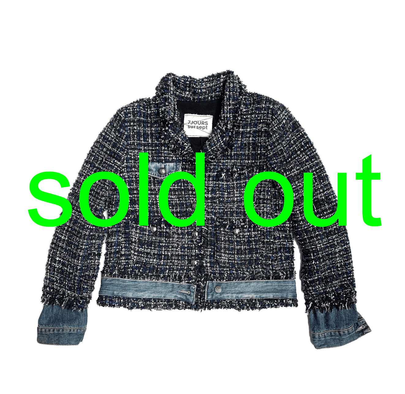 This Chanel-style tweed jacket has been transformed by the addition of worn denim cuffs, chest flap pocket and waistband.