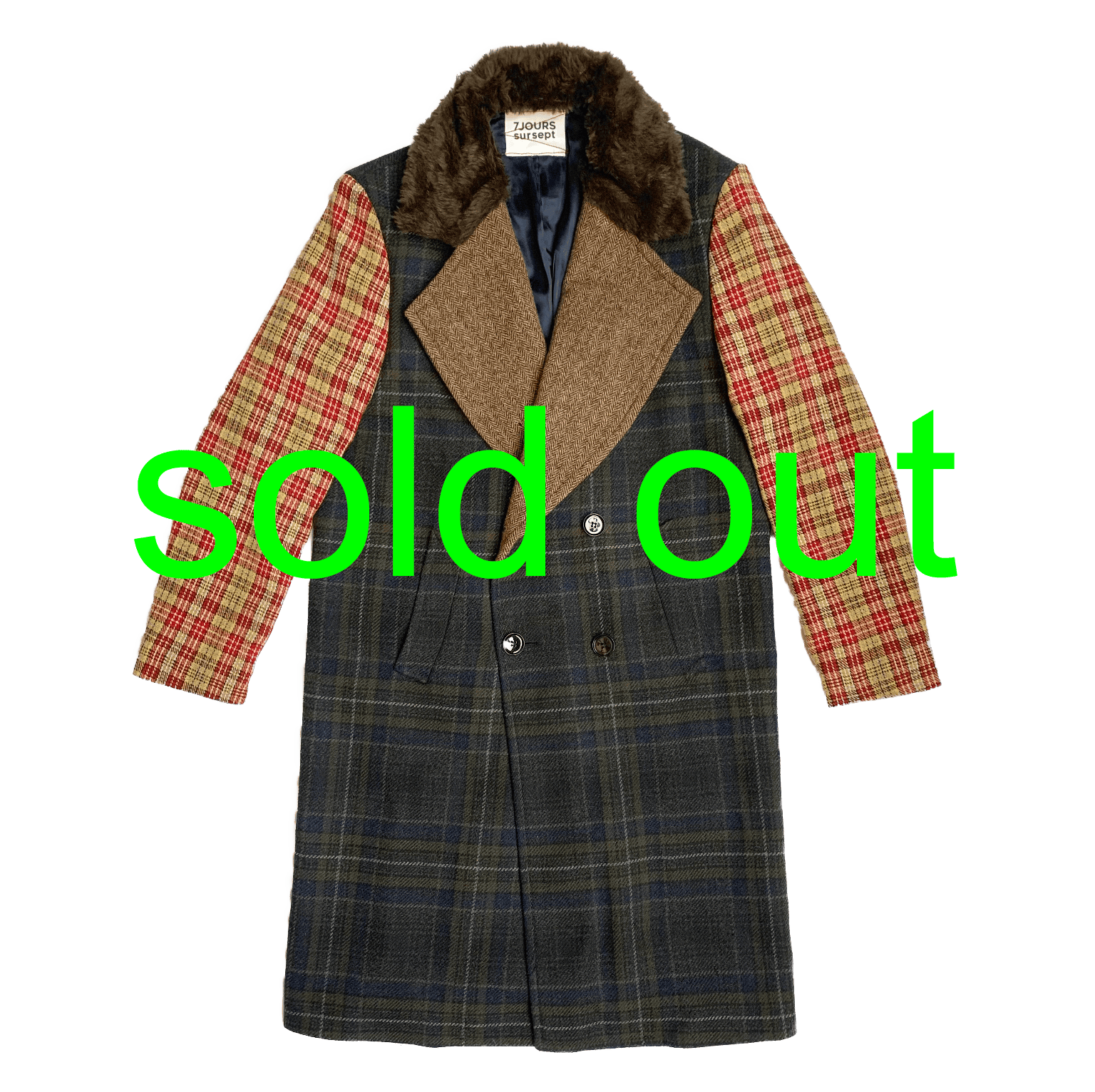 Oversized double breasted coat in dark navy blue tartan wool with fake fur collar and extra wilde herringbone lapels.The sleeves are made with two other fabrics.