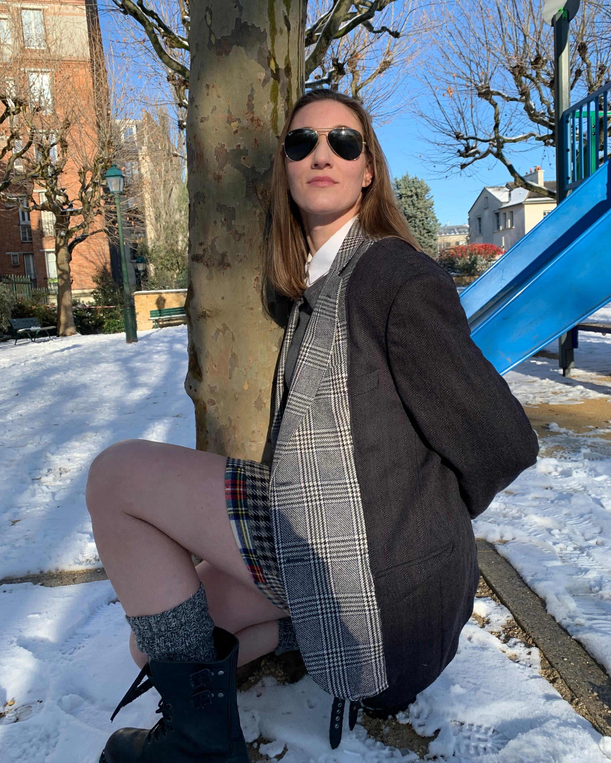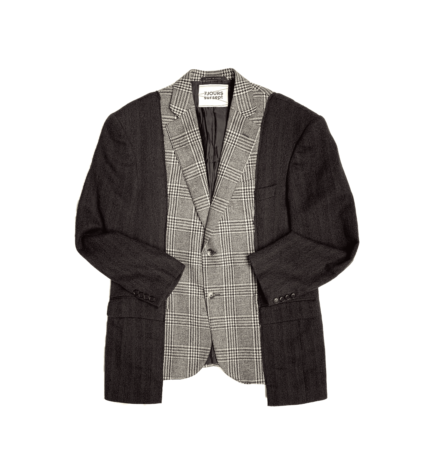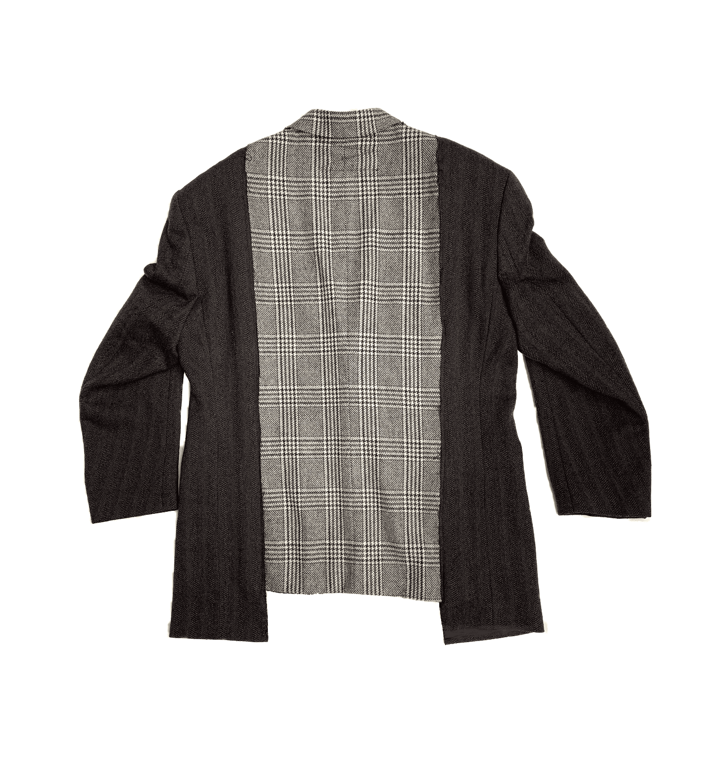 That oversized wool jacket has been made with a large men'suit brown herringbone jacket coupled with a black and white Prince of Wales one for the front and back part.