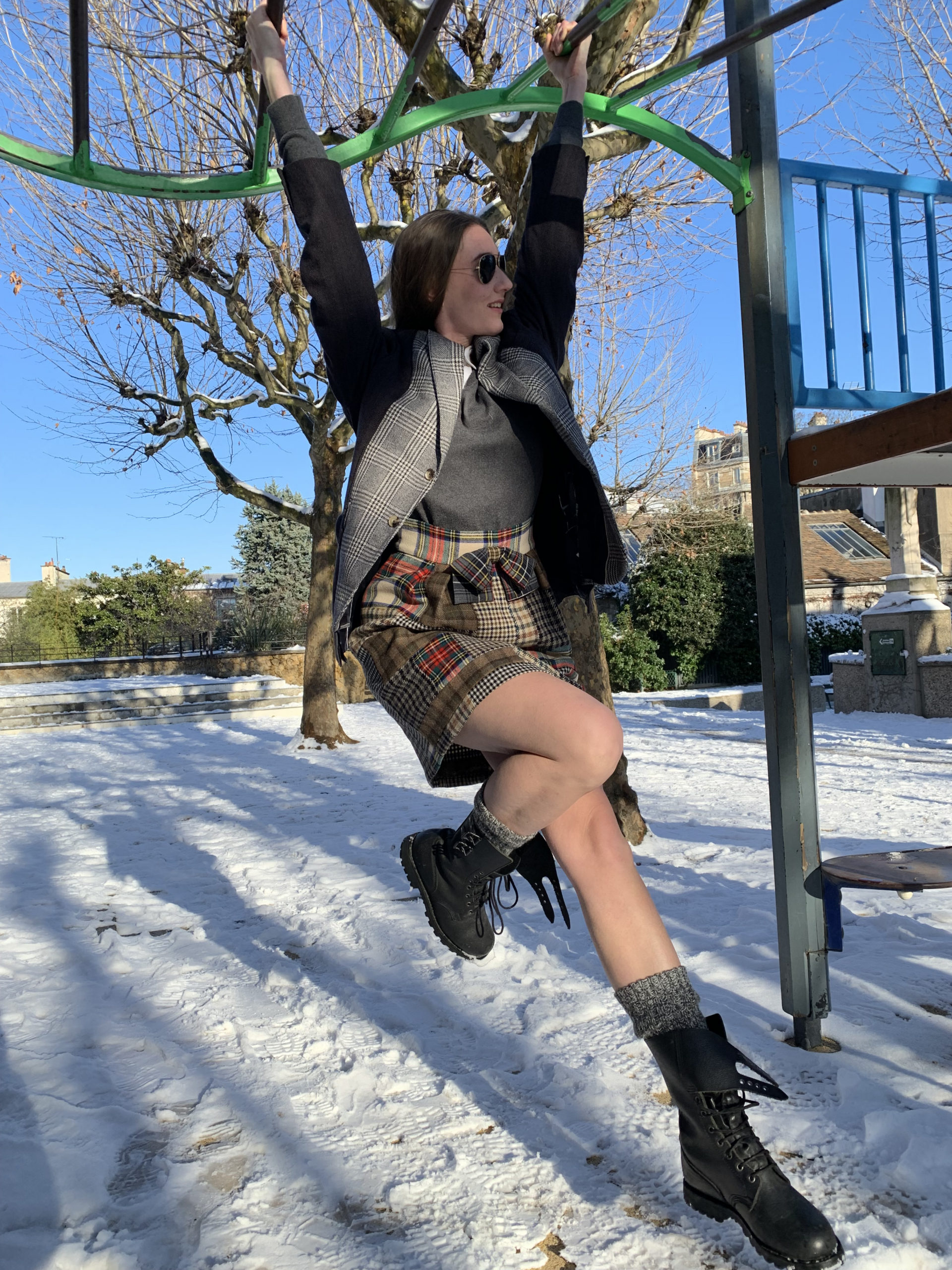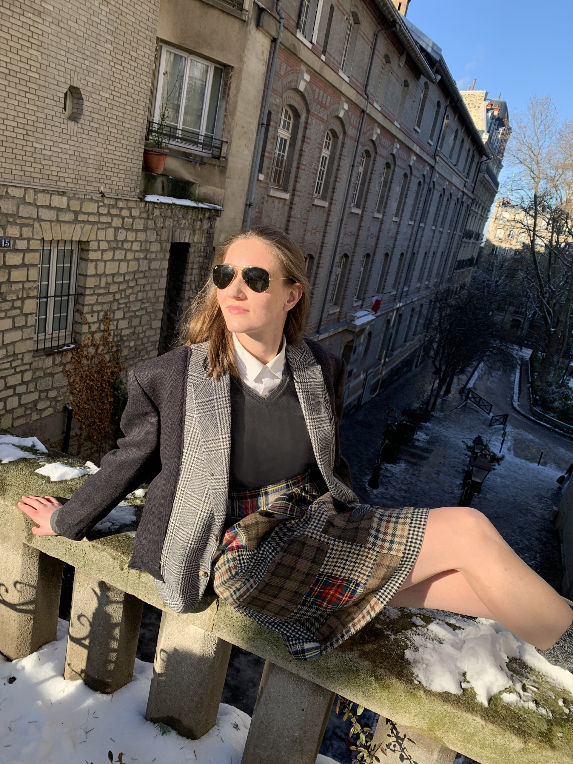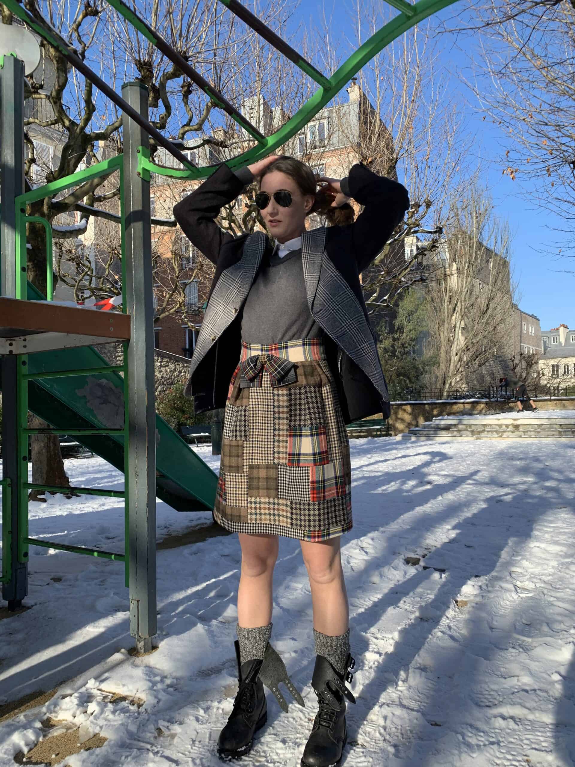 That oversized wool jacket has been made with a large men'suit brown herringbone jacket coupled with a black and white Prince of Wales one for the front and back part.