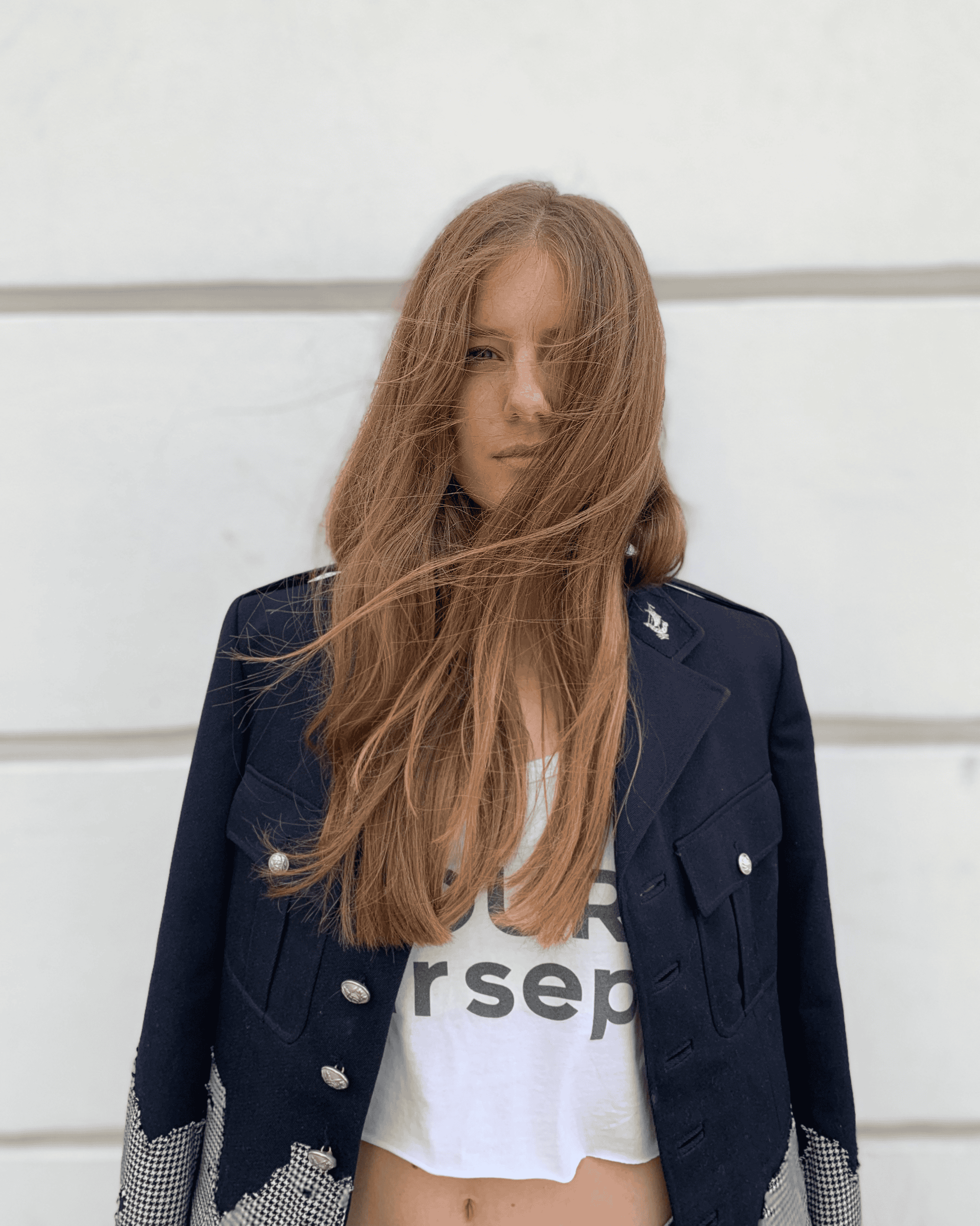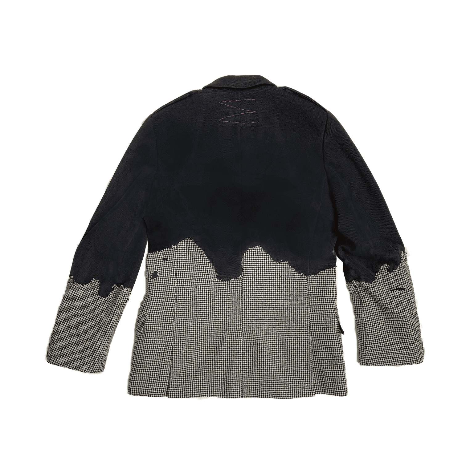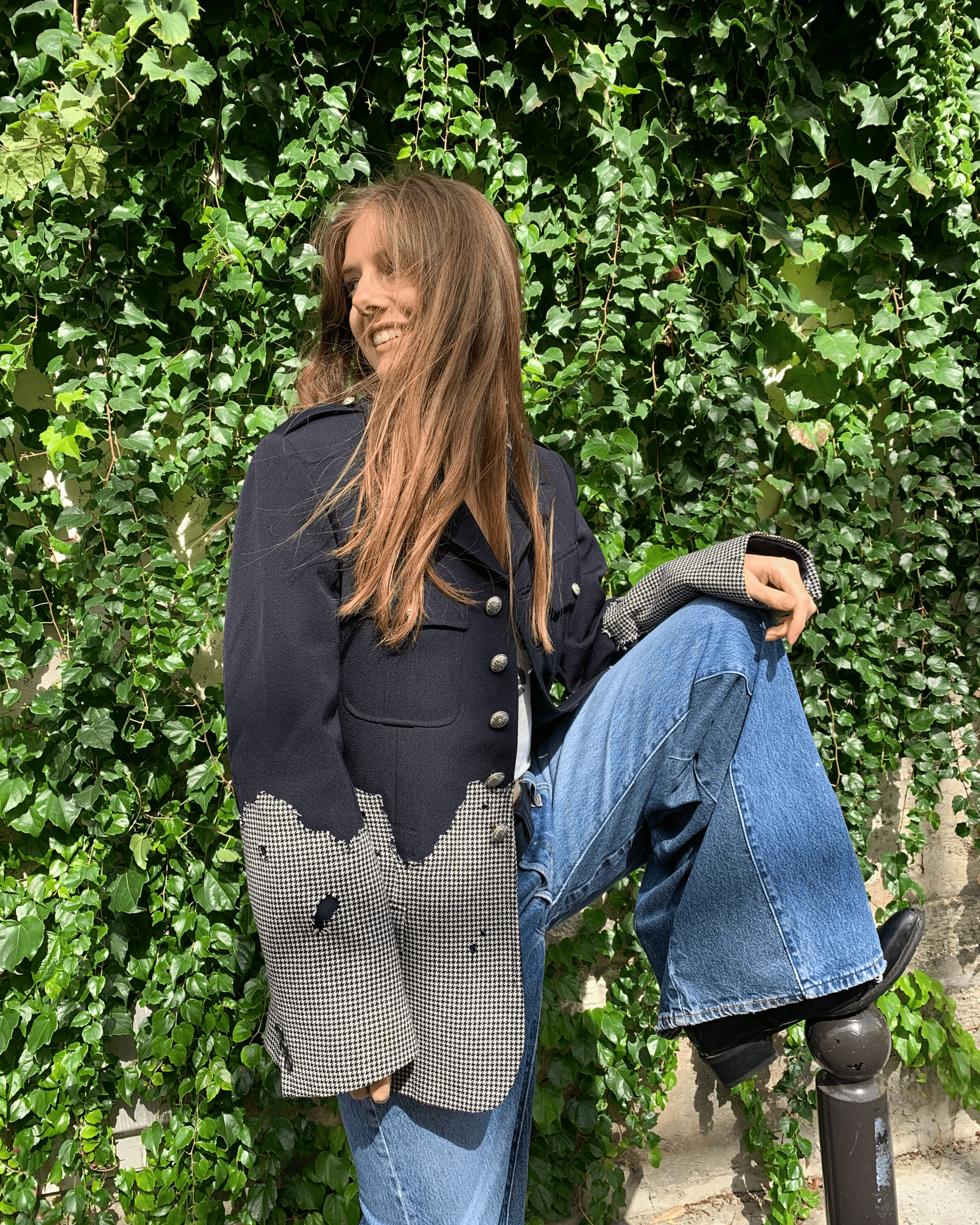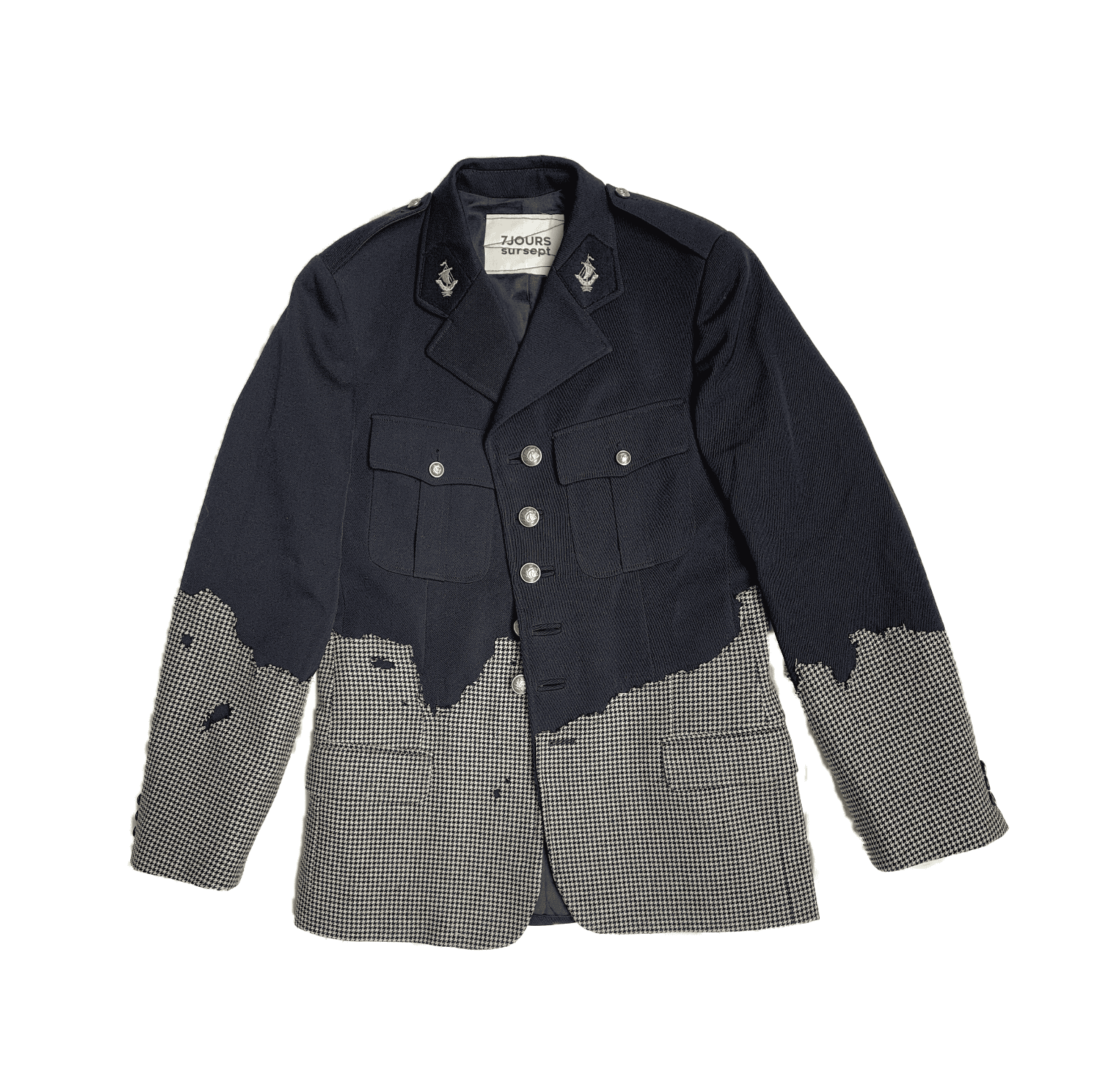 This miltary navy blue vintage jacket has been coupled all around the bottom and wrists with a worn black and white houndstooth wool man suit jacket tattered by hand. Silver metal domed buttons are sewn on the front with silver embroideries at the collar.