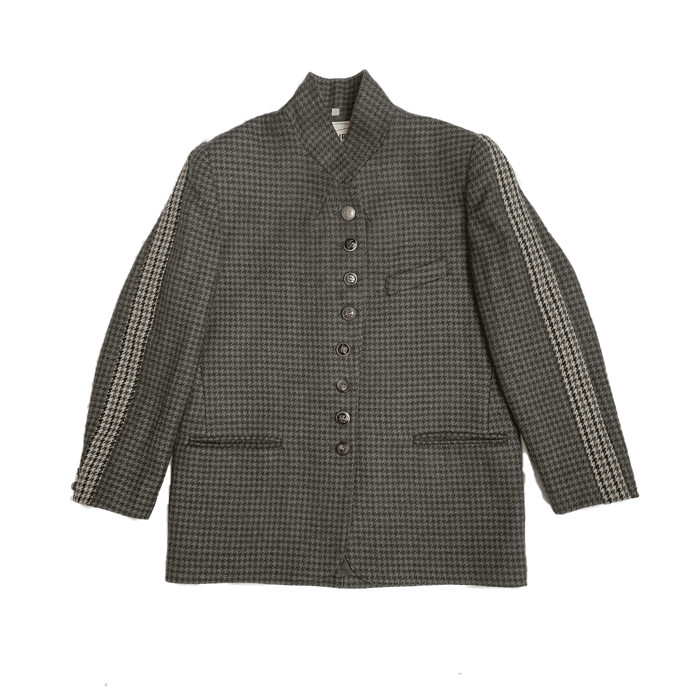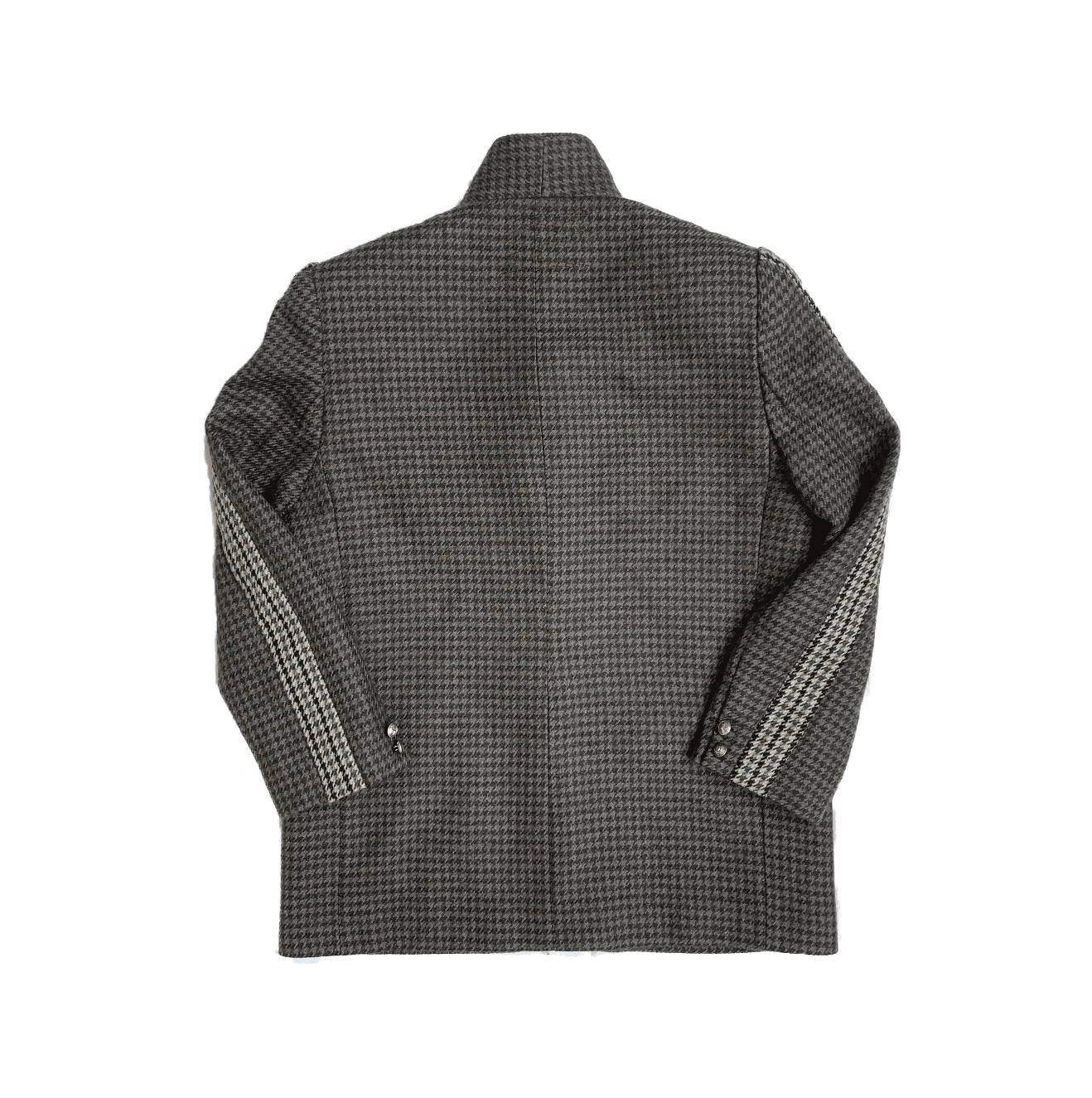 The collar of this kaki houndstooth 100% wool oversized man suit has been transformed into a stand- up one, thanks to the new buttoning. Six different vintage domed metal buttons have been added on the front. An houndstooth tape in a different color has been applied along the entire lenght of the sleeve.