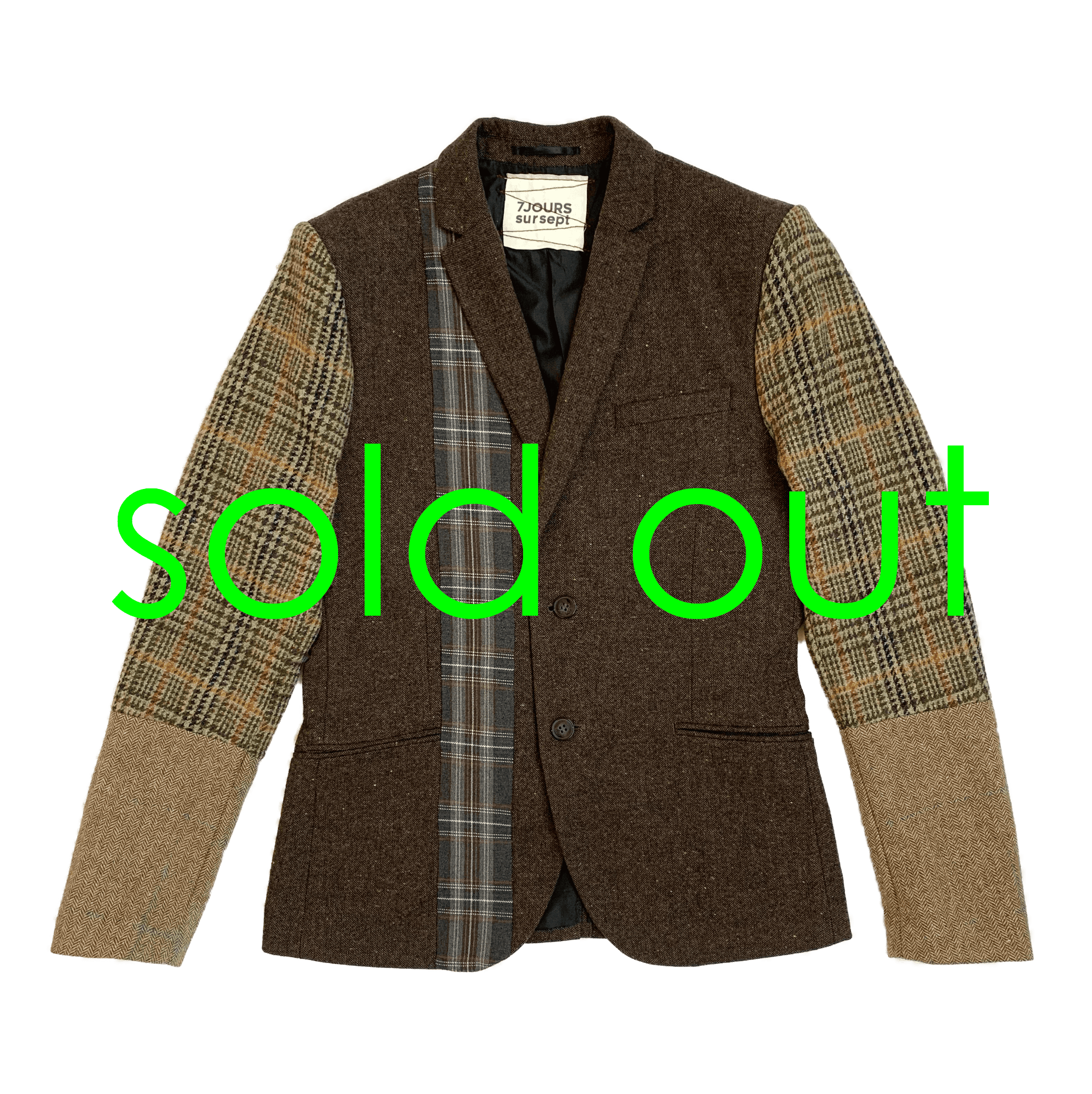 Wool vintage Prince of Wales mixed with wool worn herringbone for the sleeves of that suited brown light wool jacket with vertical grey tartan reported tape on the right side.